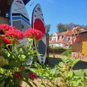 Na wyposażeniu domu dwie deski SUP…a przy jeziorze wypożyczalnia wszelkiego rodzaju sprzętu wodnego.