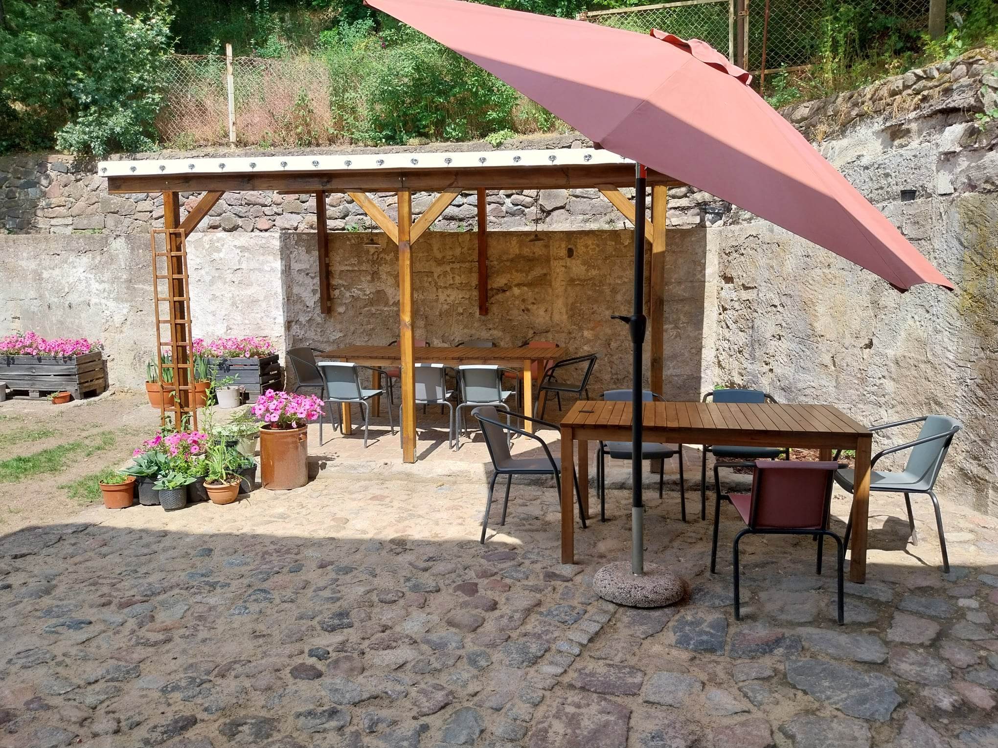 Grill w ogrodzie oraz miejsce do wypoczynku.